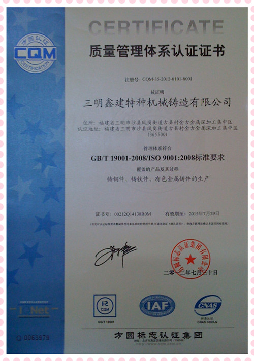 ★ 2011年,福建三明鑫建特種機(jī)械鑄造有限公司被中國化工集團(tuán)公司評為優(yōu)秀供應(yīng)商,此次參評的三明企業(yè)共7家企業(yè),三明鑫建特種機(jī)械鑄造有限公司是唯一獲此殊榮的企業(yè)。